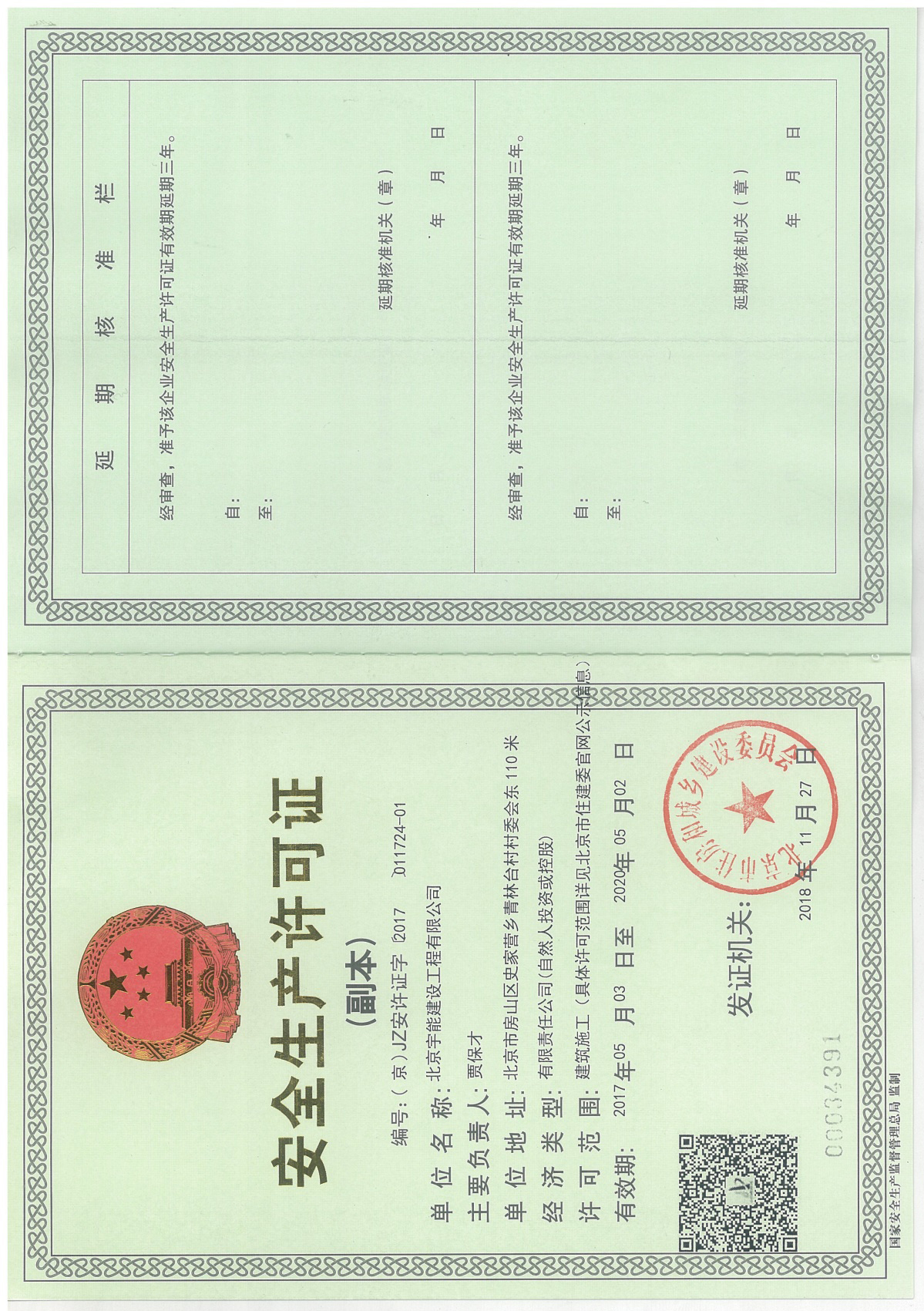 北京宇能建設(shè)工程有限公司成立于2014年5月16日,前身是北京博遠(yuǎn)天宇電力科技有限公司,注冊(cè)資金6600萬(wàn)元。具有《市政公用工程施工總承包叁級(jí)》、《機(jī)電工程施工總承包叁級(jí)》、《建筑工程施工總承包叁級(jí)》、《建筑裝修裝飾工程專業(yè)承包貳級(jí)》、《電子與智能化工程專業(yè)承包貳級(jí)》、《鋼結(jié)構(gòu)工程專業(yè)承包叁級(jí)》、《防水防腐保溫工程專業(yè)承包貳級(jí)》、《建筑幕墻工程專業(yè)承包貳級(jí)》、《模板腳手架資質(zhì)》等;同時(shí)榮獲AAA誠(chéng)信企業(yè)證書、AAA級(jí)誠(chéng)信經(jīng)營(yíng)示范單位、AAA重合同守信用企業(yè)證書、AAA級(jí)企業(yè)資信等級(jí)證書。鑒于公司領(lǐng)導(dǎo)的為人誠(chéng)信,作風(fēng)良好,經(jīng)315全國(guó)征信系統(tǒng)誠(chéng)信企業(yè)認(rèn)證中心頒發(fā)誠(chéng)信企業(yè)家榮譽(yù)證書及誠(chéng)信經(jīng)理人的榮譽(yù)稱號(hào)。