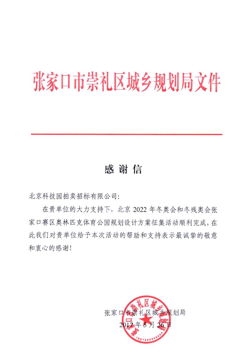 2022冬奧會和動殘奧會張家口賽區(qū)奧林匹克體育公園規(guī)劃設(shè)計方案征集感謝信