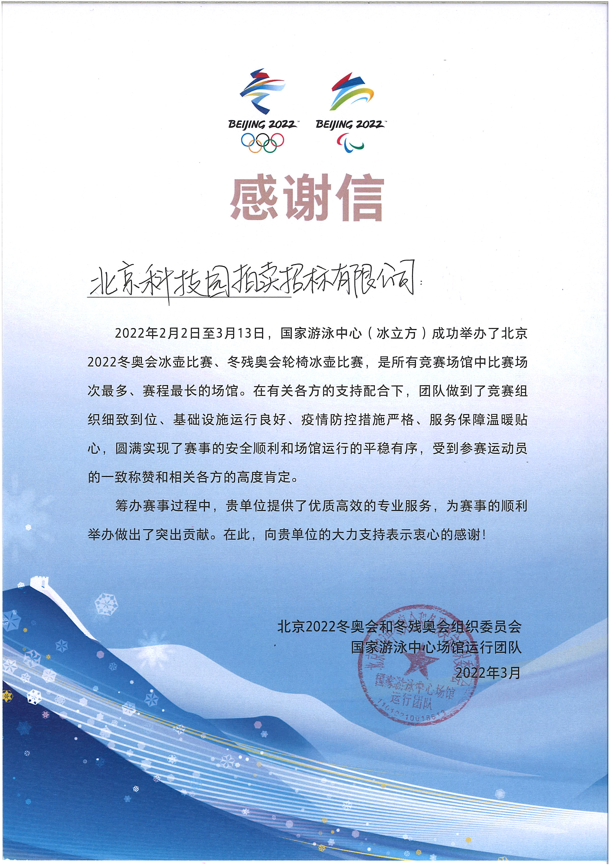 國(guó)家游泳中心場(chǎng)館運(yùn)行團(tuán)隊(duì)感謝信