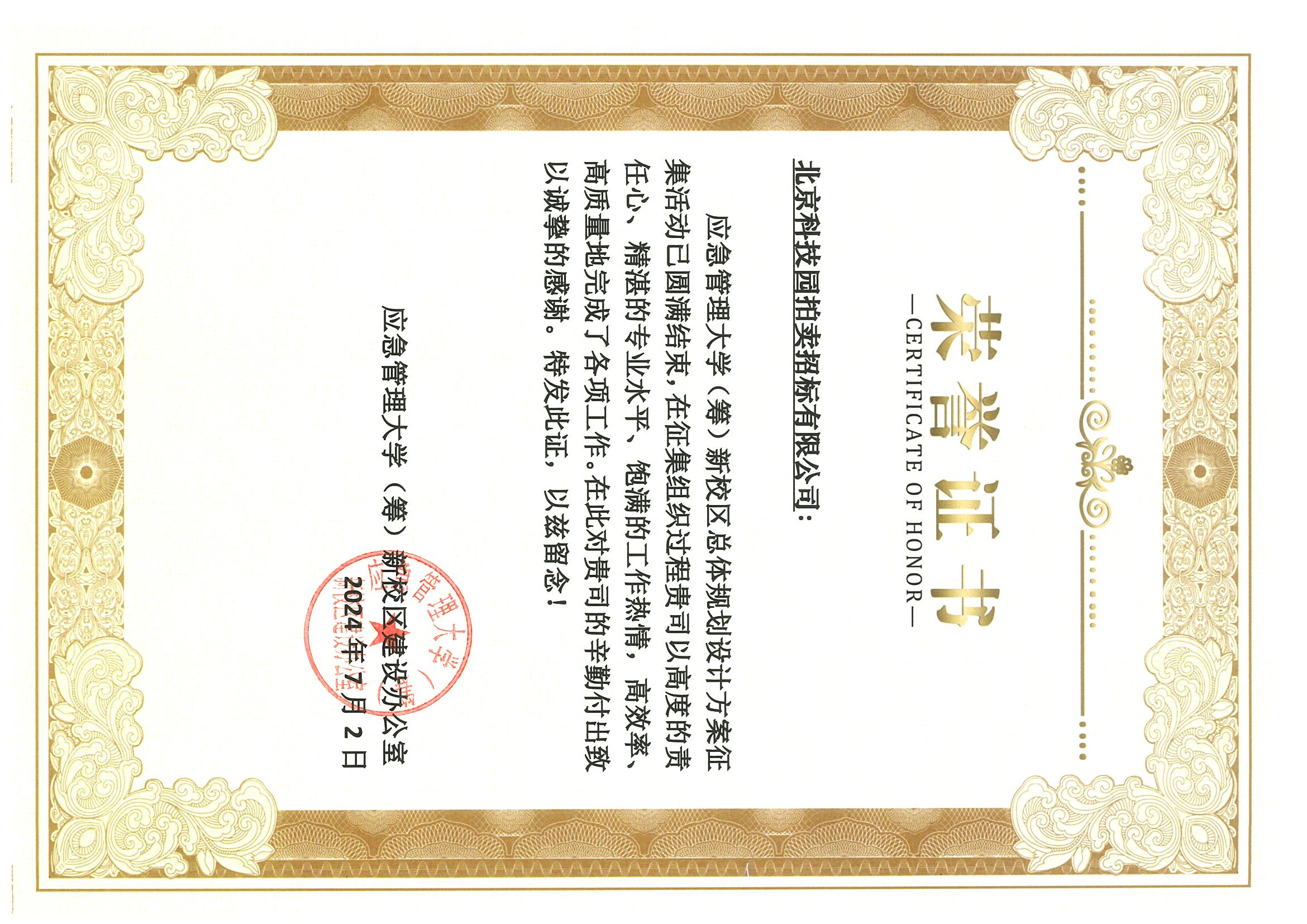 應(yīng)急管理大學(xué)(籌)新校區(qū)總體規(guī)劃設(shè)計(jì)方案征集榮譽(yù)證書(shū)