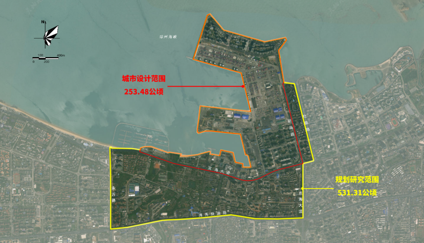 The urban design area covers the core zone of Xiuying Port, stretching from Lijing Road in the east to the Guofan Base Wharf in the west, bounded by Binhai Avenue in the south and the Qiongzhou Strait in the north, with an area of approximately 253.48 hectares.
