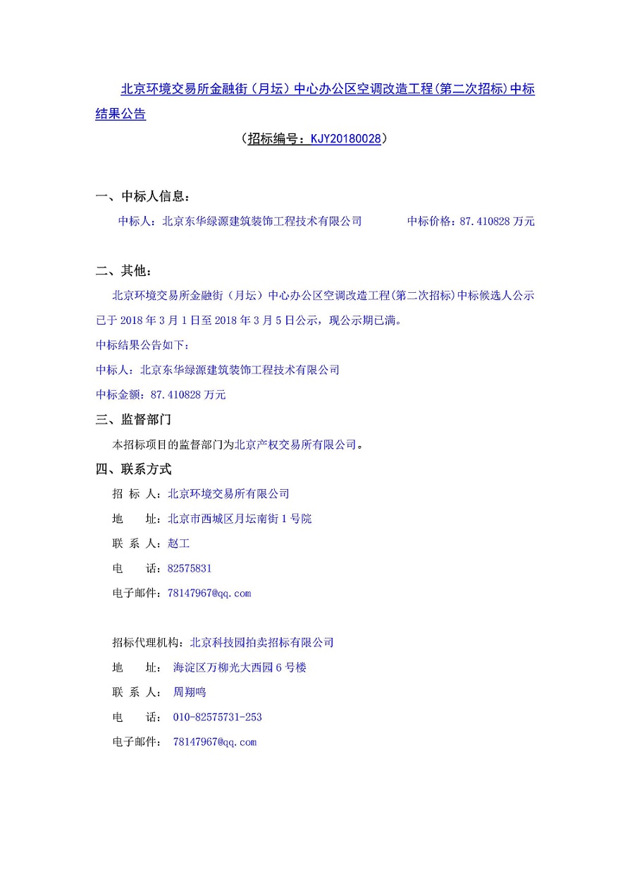 北京環(huán)境交易所金融街(月壇)中心辦公區(qū)空調(diào)改造工程(第二次招標(biāo))中標(biāo)結(jié)果公告