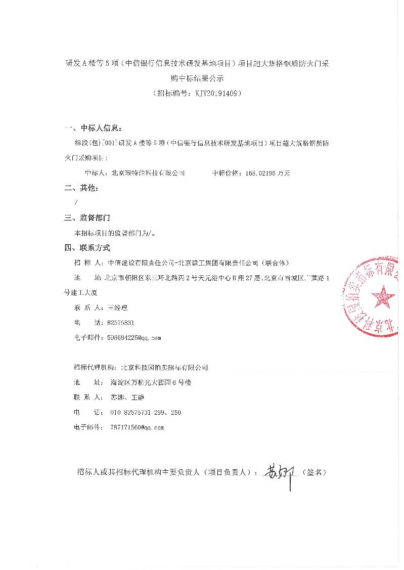 研發(fā)A樓等5項(xiàng)(中信銀行信息技術(shù)研發(fā)基地項(xiàng)目)超大規(guī)格鋼質(zhì)防火門采購(gòu)中標(biāo)結(jié)果公示