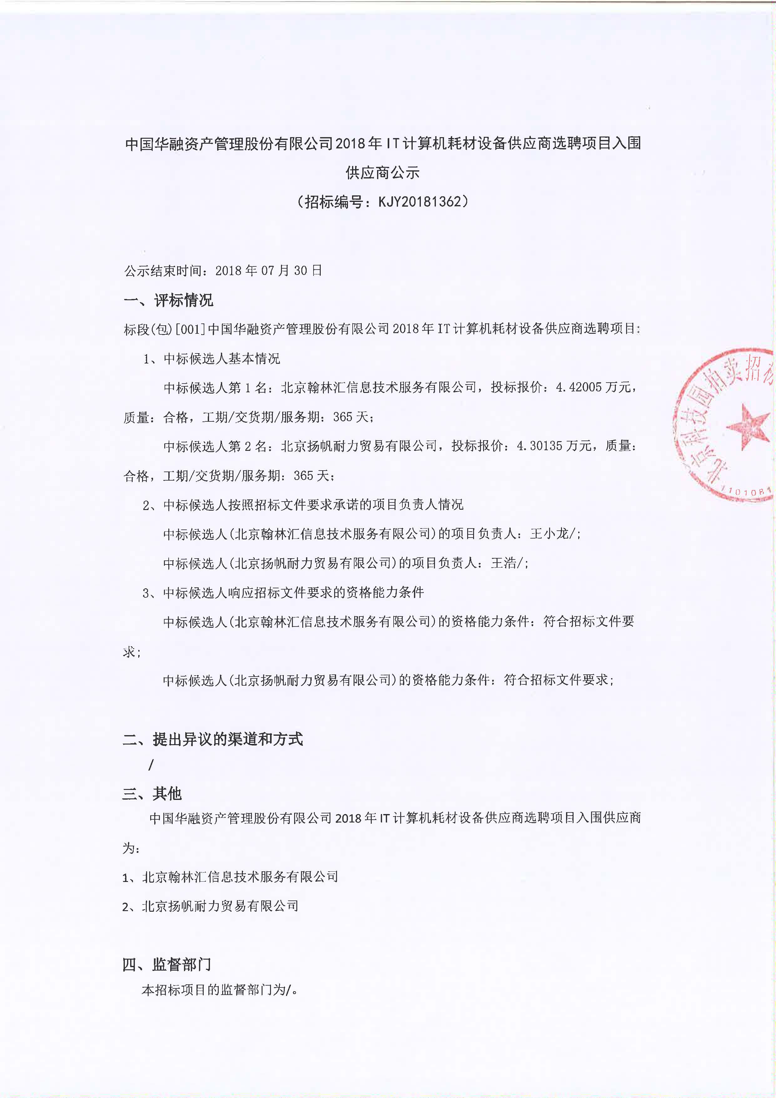 中國華融資產(chǎn)管理股份有限公司2018年IT計算機耗材設備供應商選聘項目入圍供應商公示